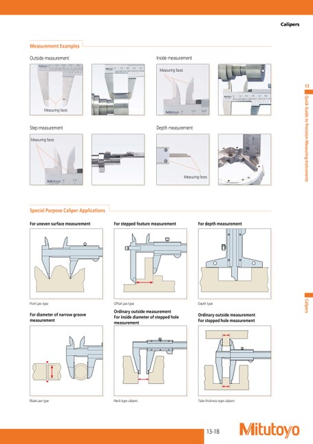 CalipersMeasurementExamplesOutsidemeasurementMeasuringfacesStepmeasurementMeasuringfacesInsidemeasurementMeasuringfacesDepthmeasurementMeasuringfacesSpecialPurposeCaliperApplicationsForunevensurfacemeasurementForsteppedfeaturemeasurementFordepthmeasurementCalipersPointjawtypeOffsetjawtypeDepthtypeFordiameterofnarrowgroovemeasurementOrdinaryoutsidemeasurementForinsidediameterofsteppedholemeasurementOrdinaryoutsidemeasurementForsteppedholemeasurementBladejawtypeNeck-typecalipersTubethickness-typecalipers13-18