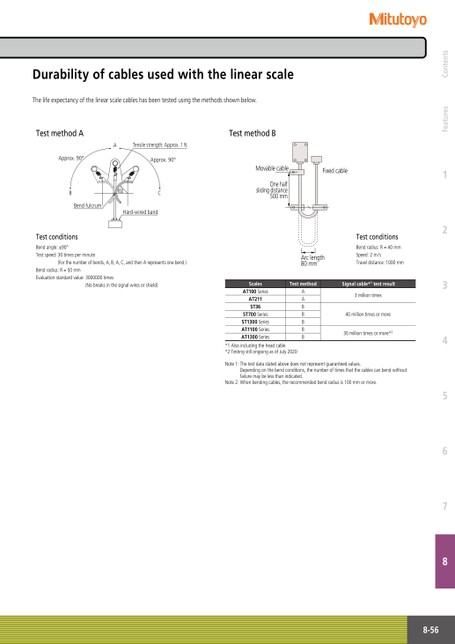 DurabilityofcablesusedwiththelinearscaleThelifeexpectancyofthelinearscalecableshasbeentestedusingthemethodsshownbelow.TestmethodATestmethodBATensilestrength:Approx.1NApprox.90°Approx.90°BR50CBendfulcrumHard-wiredbandTestconditionsBendangle:±90°Testspeed:30timesperminute(Forthenumberofbends,A,B,A,C,andthenArepresentsonebend.)Bendradius:R=50mmEvaluationstandardvalue:3000000times(Nobreaksinthesignalwiresorshield)FixedcableMovablecableOnehalfslidingdistance500mmTestconditionsBendradius:R=40mmSpeed:2m/sTraveldistance:1000mmArclength80mmTestmethodSignalcable*1testresultAABBBBB3milliontimes40milliontimesormore30milliontimesormore*2ScalesAT100SeriesAT211ST36ST700SeriesST1300SeriesAT1100SeriesAT1300Series*1Alsoincludingtheheadcable*2TestingstillongoingasofJuly2020Note1:Thetestdatastatedabovedoesnotrepresentguaranteedvalues.Dependingonthebendconditions,thenumberoftimesthatthecablescanbendwithoutfailuremaybelessthanindicated.Note2:Whenbendingcables,therecommendedbendradiusis100mmormore.8-56